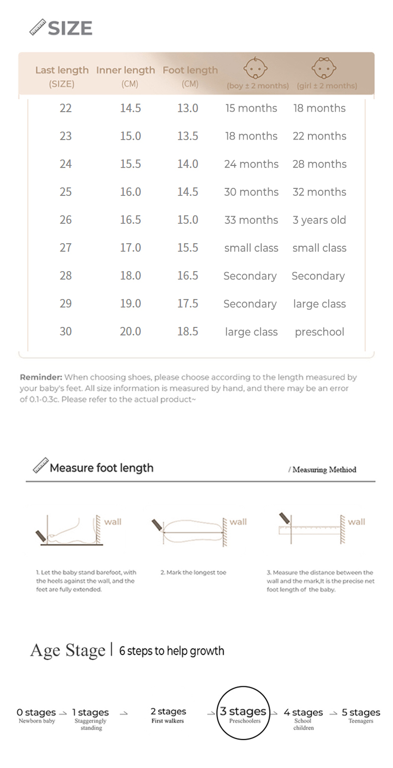 Size: 22 yard fit foot length 13.0 Inside 14.5 23 yard fit foot length 13.5 inside 15.0 24 yard fit foot length 14.0 inside 15.5 25 yard fit foot length 14.5 inside 16.0 26 yard fit foot length 15.0 inside 16.5 27 yard fit foot length 15.5 inside 17.0 28 yard Fit foot length 16.5 inner length 18.0 29 yard fitting foot length 17.5 inner length 19.0 30 yard fitting foot length 18.5 Inner length 20.0
